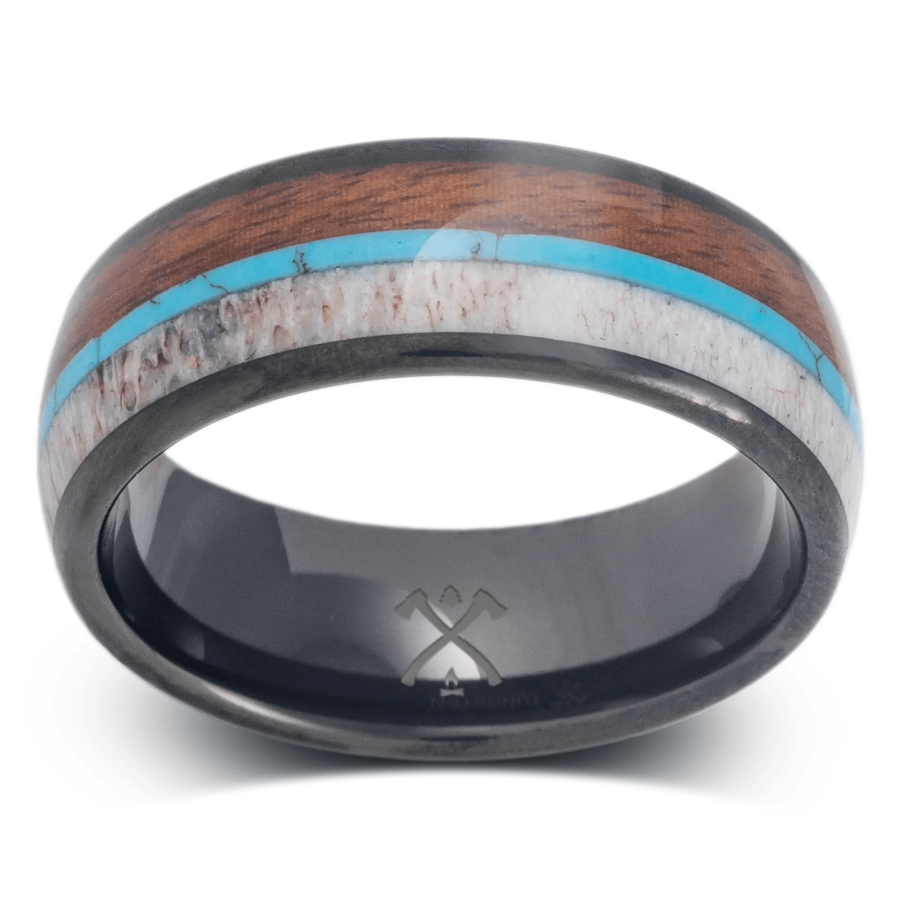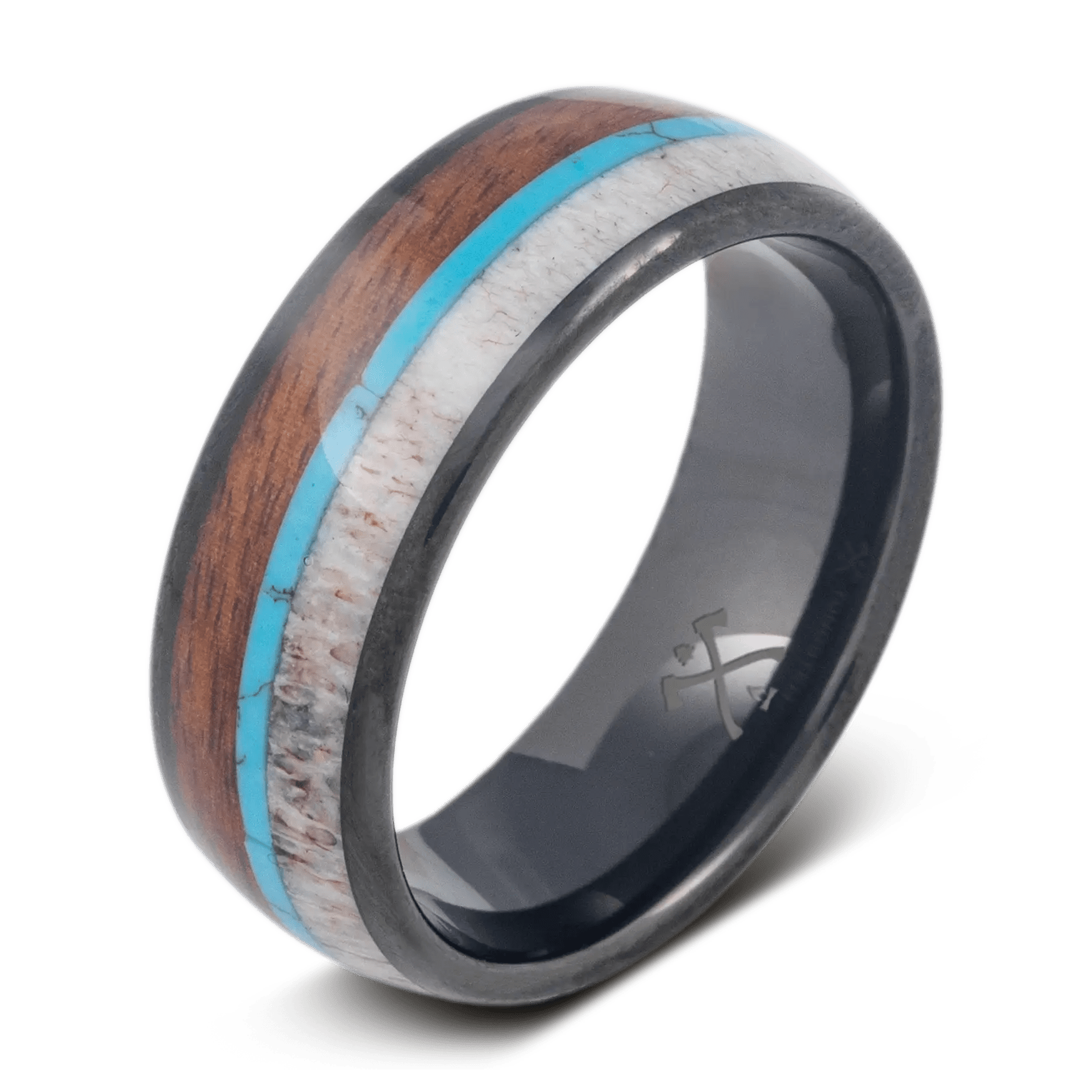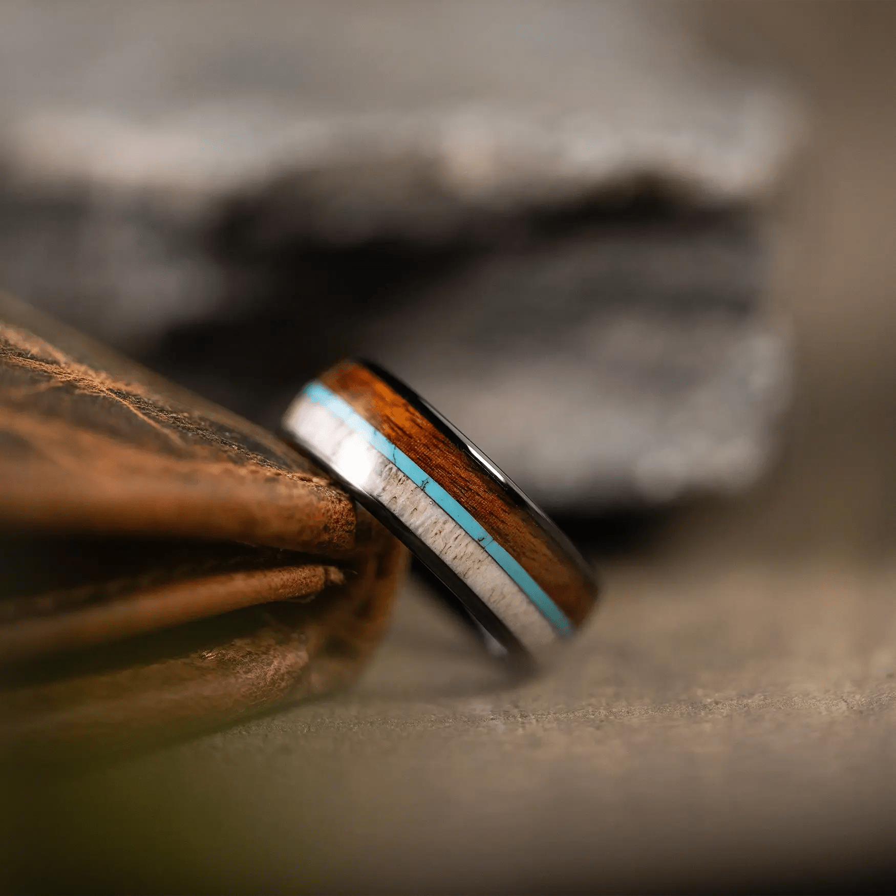- Black Plated Tungsten with Turquoise, Deer Antler, and Koa Wood Inlays