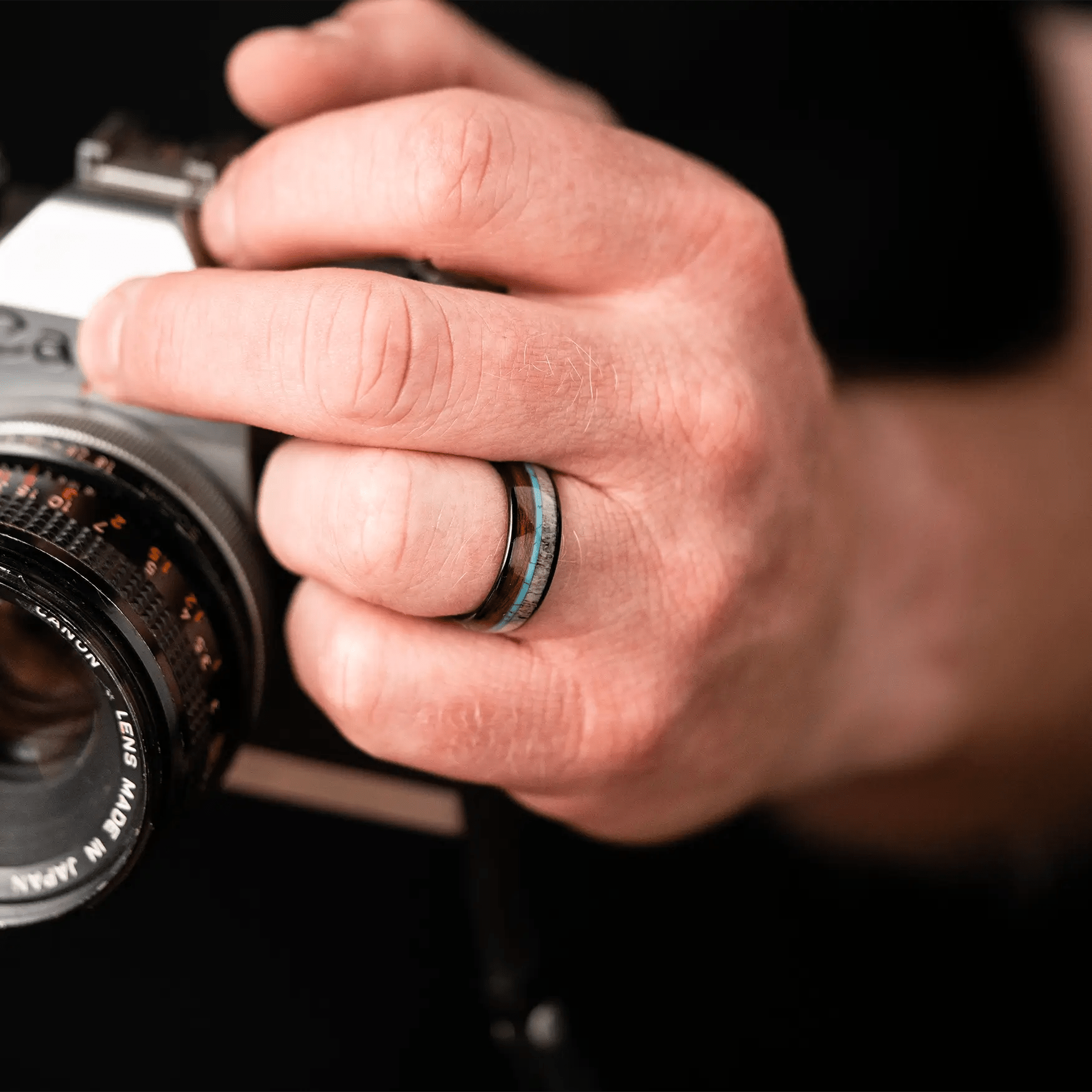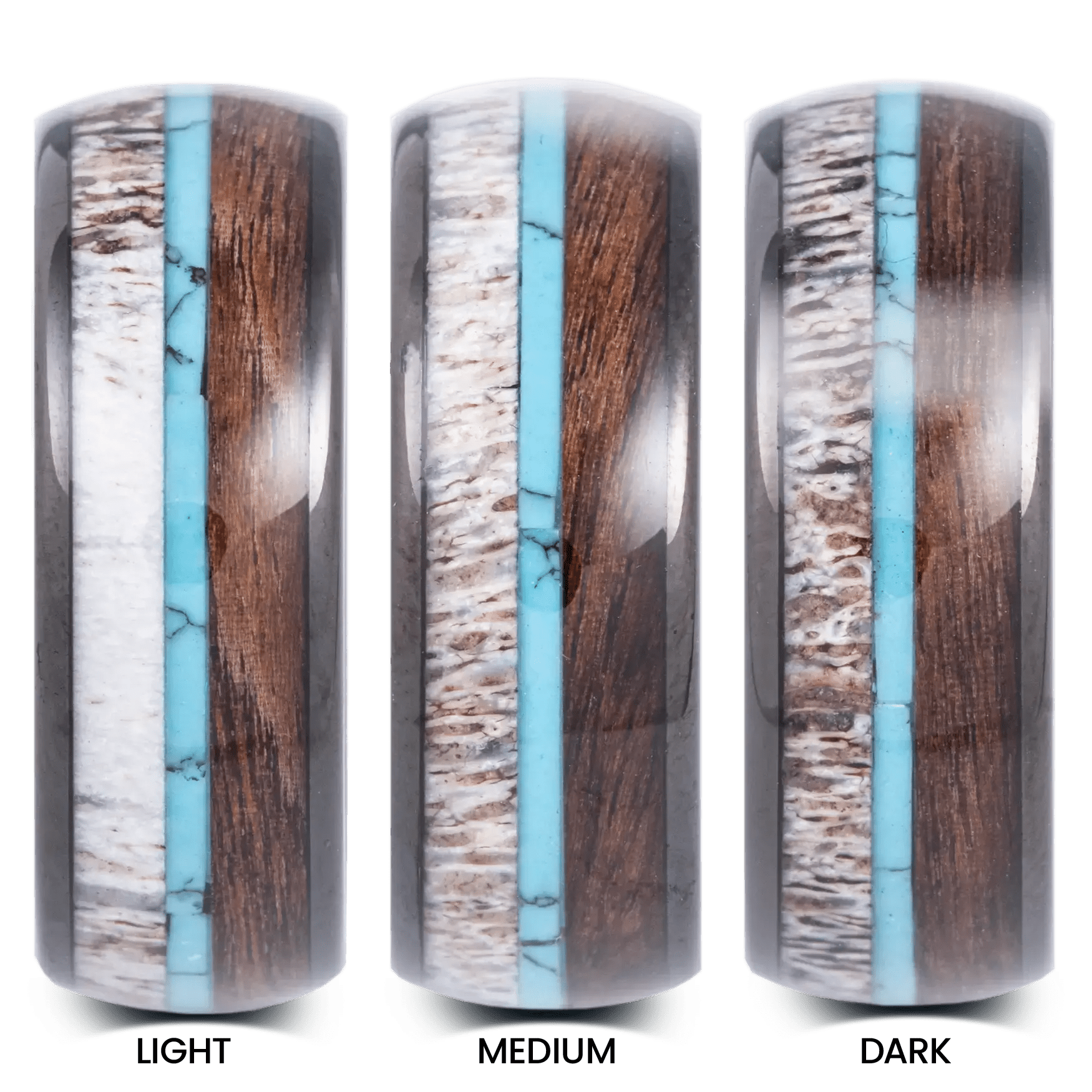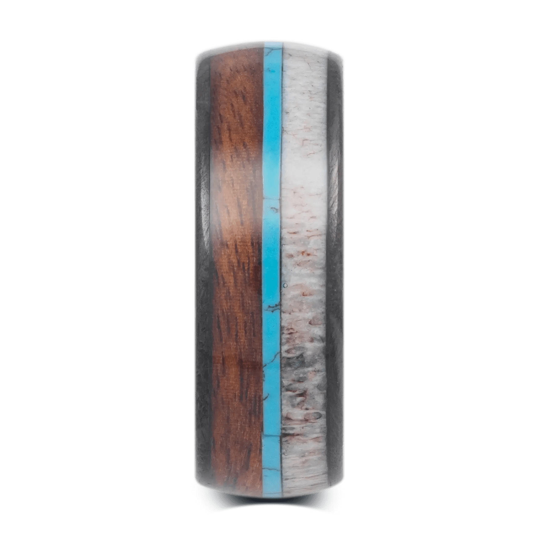 - Black Plated Tungsten with Turquoise, Deer Antler, and Koa Wood Inlays