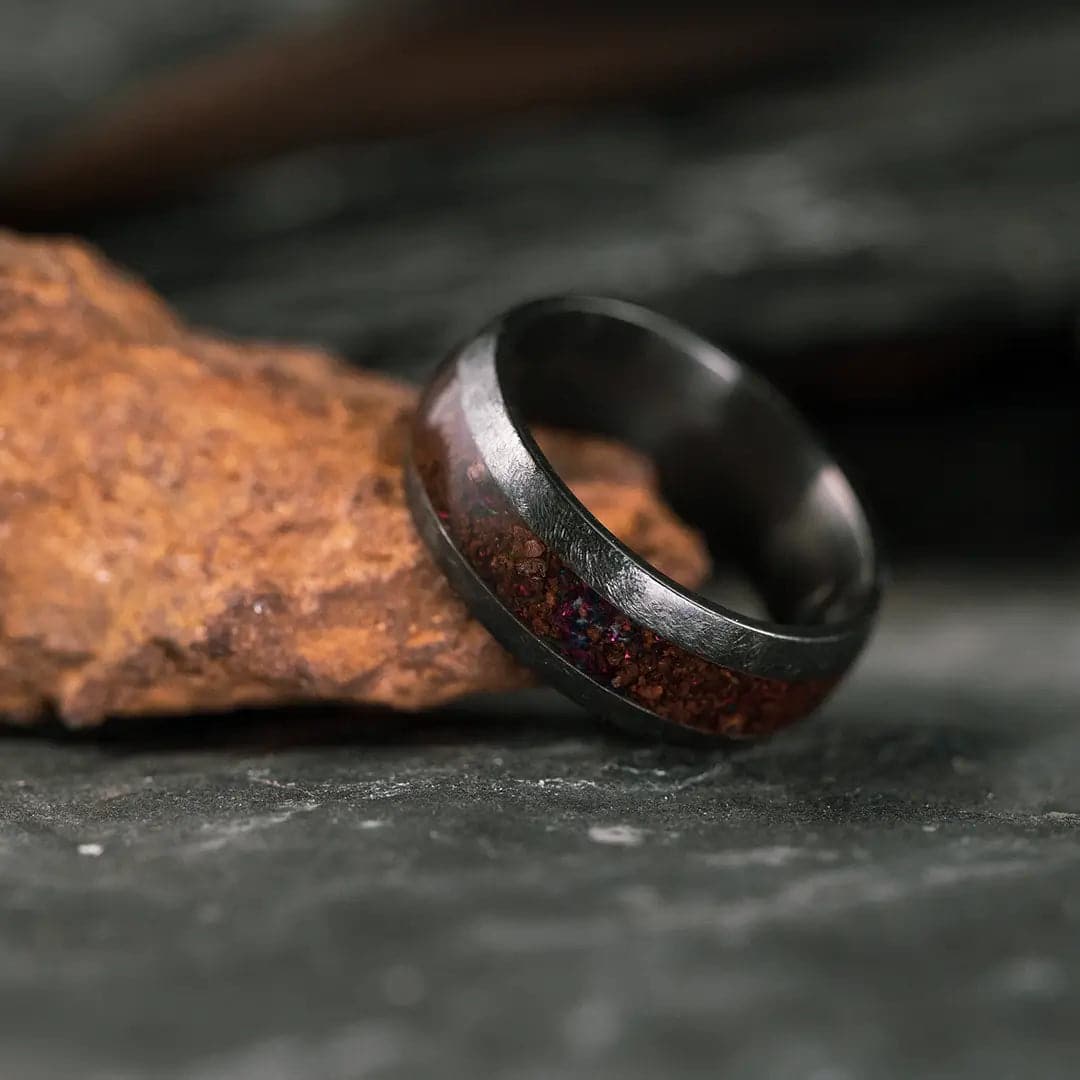 - Black Zirconium (charcoal gray color) with 4mm Authenticated T-Rex Dinosaur Bone and Lava Rock Opal Inlay