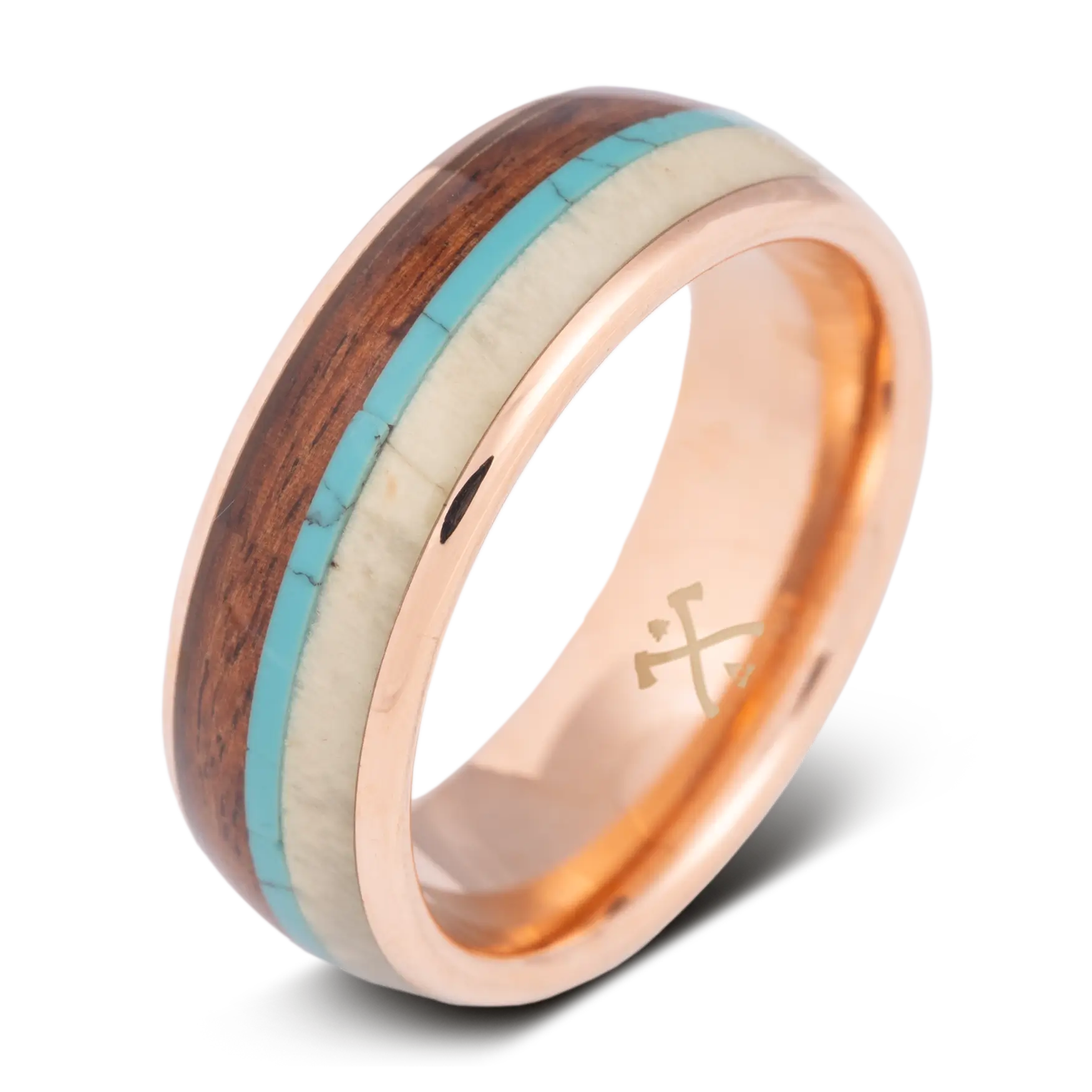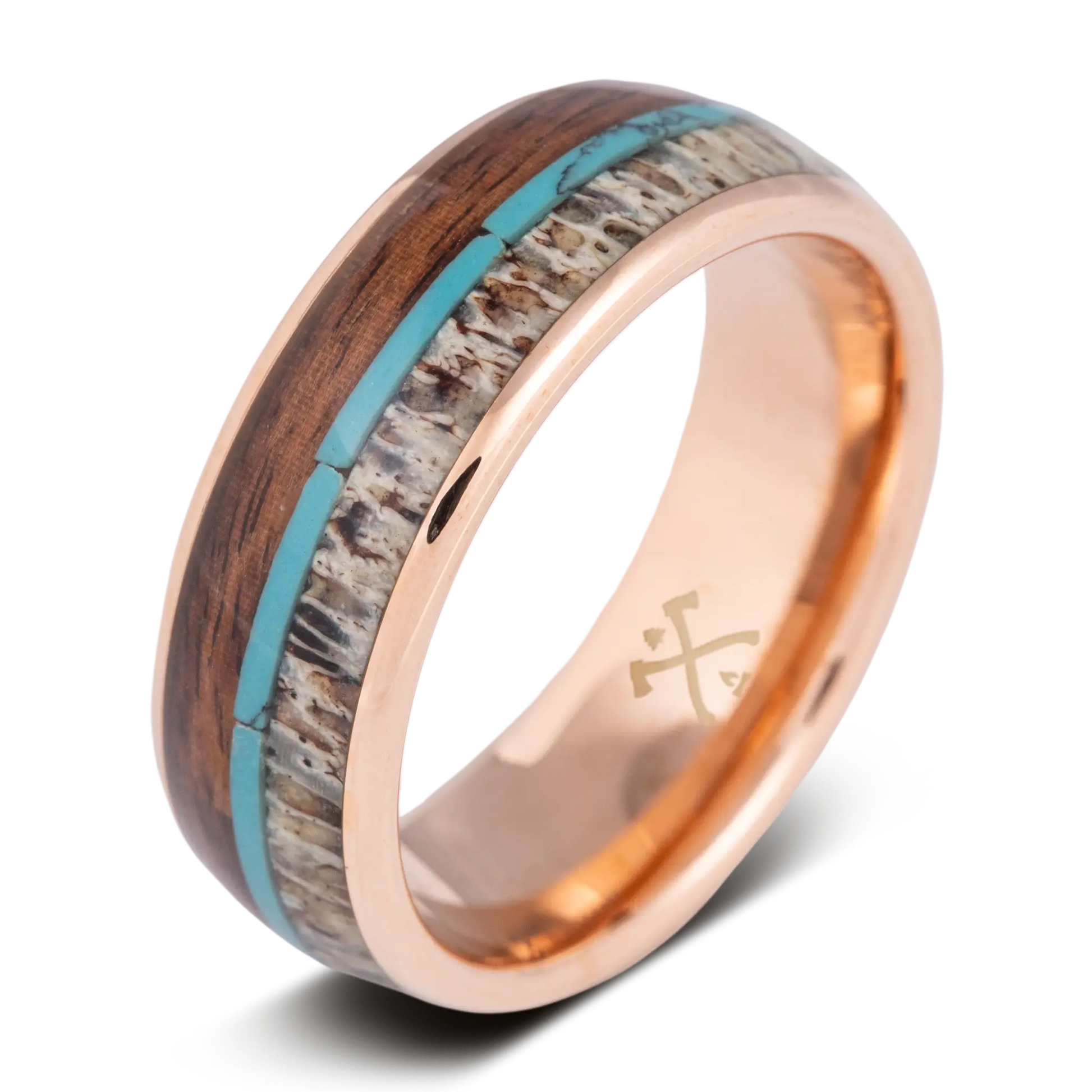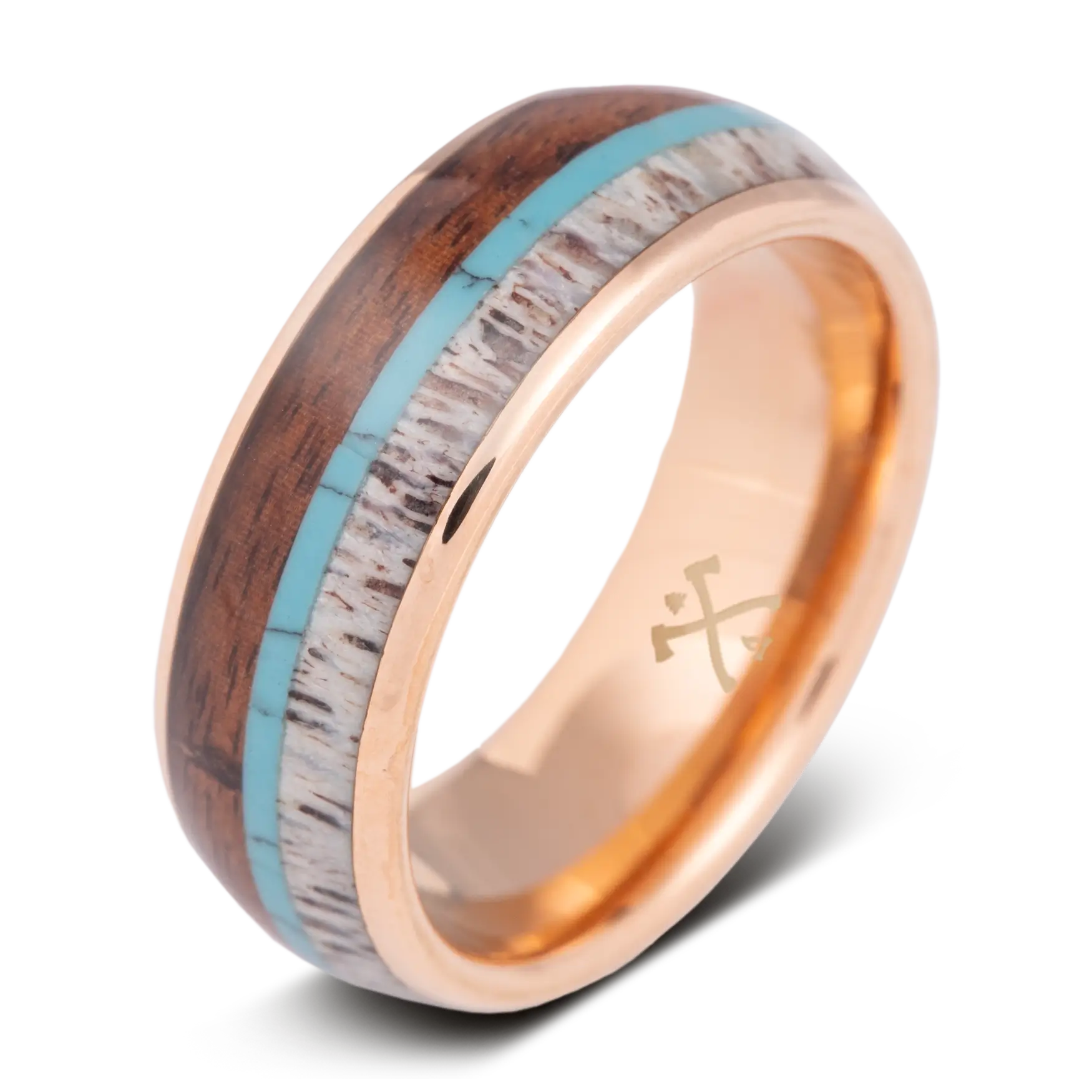 - 18K Rose Gold Plated Tungsten with Turquoise, Deer Antler, and Koa Wood Inlays