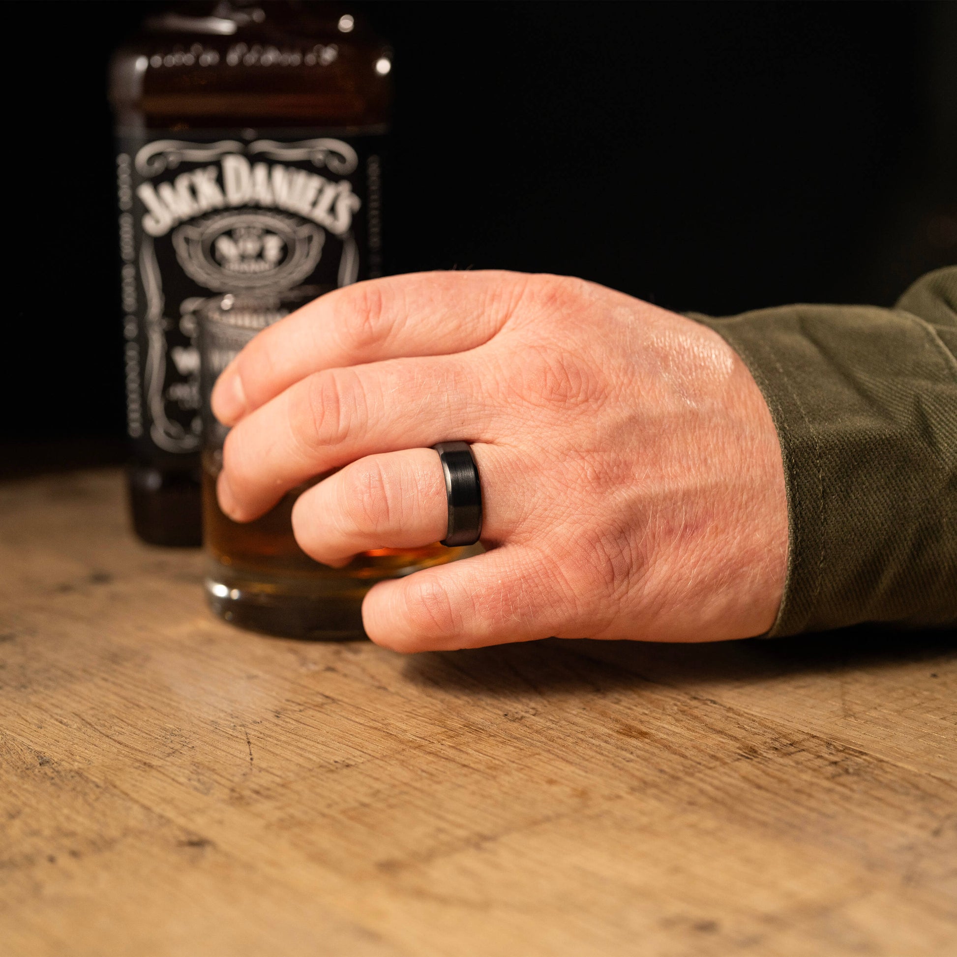 Ben is a great employee but like every coder, he's afraid Ai is going to take his job. So he works fast but Ai is faster. You know what he doesn't quietly quit at - Cigars. If you're rushing a cigar, you're doing it wrong. You know what else is a sweet pairing with Ben's cigar? A Jack Daniel's - on the rocks. His left handed grasp always reminds him of his unwavering love for this pairing -- oh and his wife. The Aficionado ring, exclusively from Manly Bands.