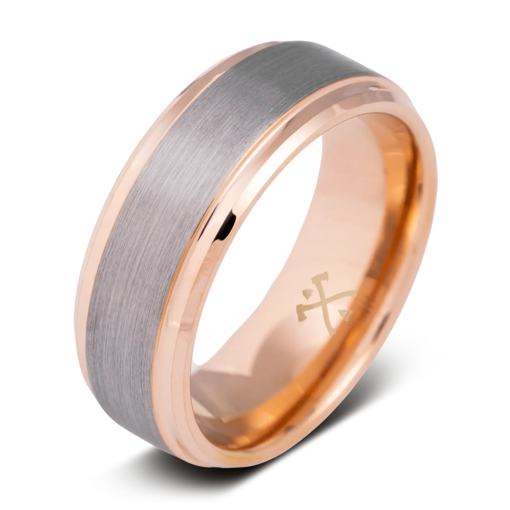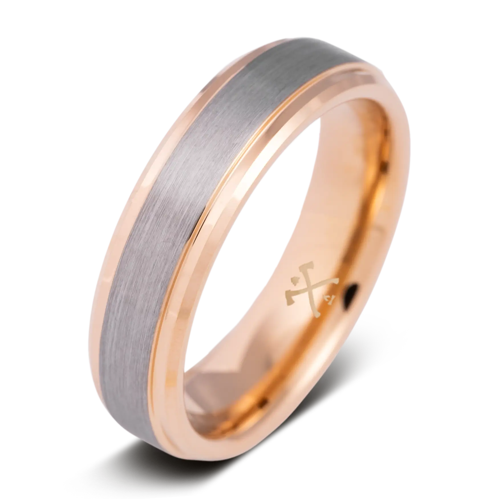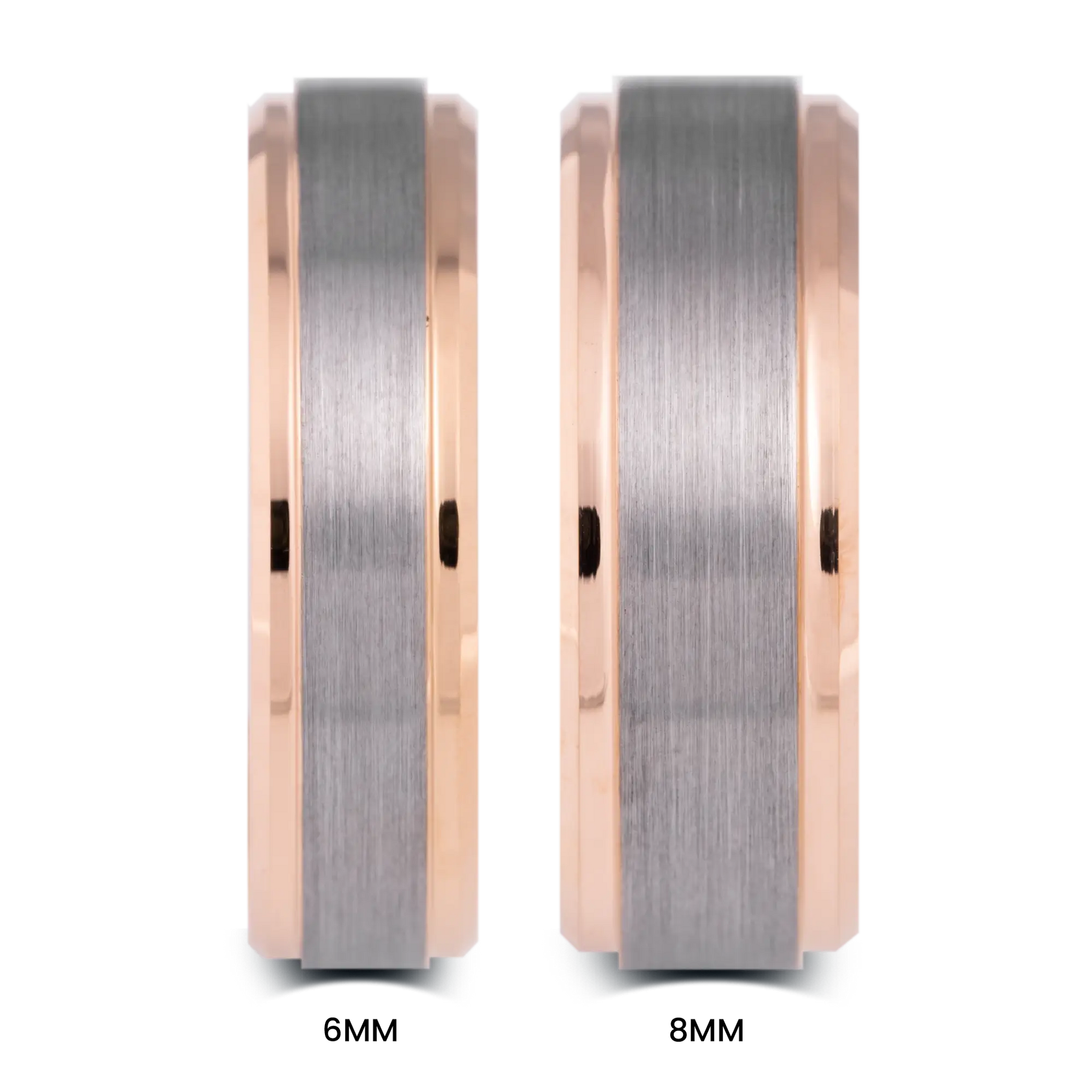 • Tungsten with 18K Rose Gold Plated Sleeve and Sides