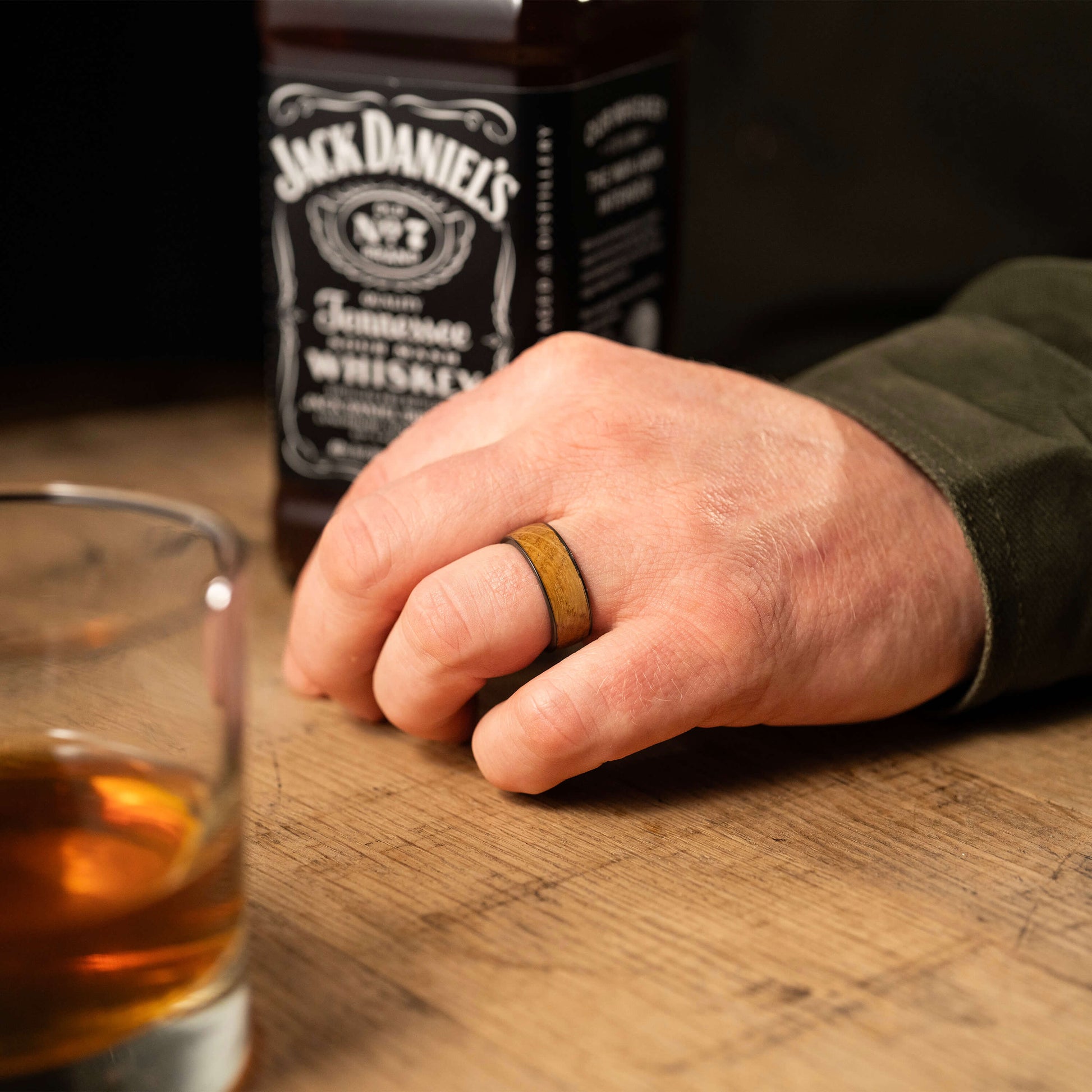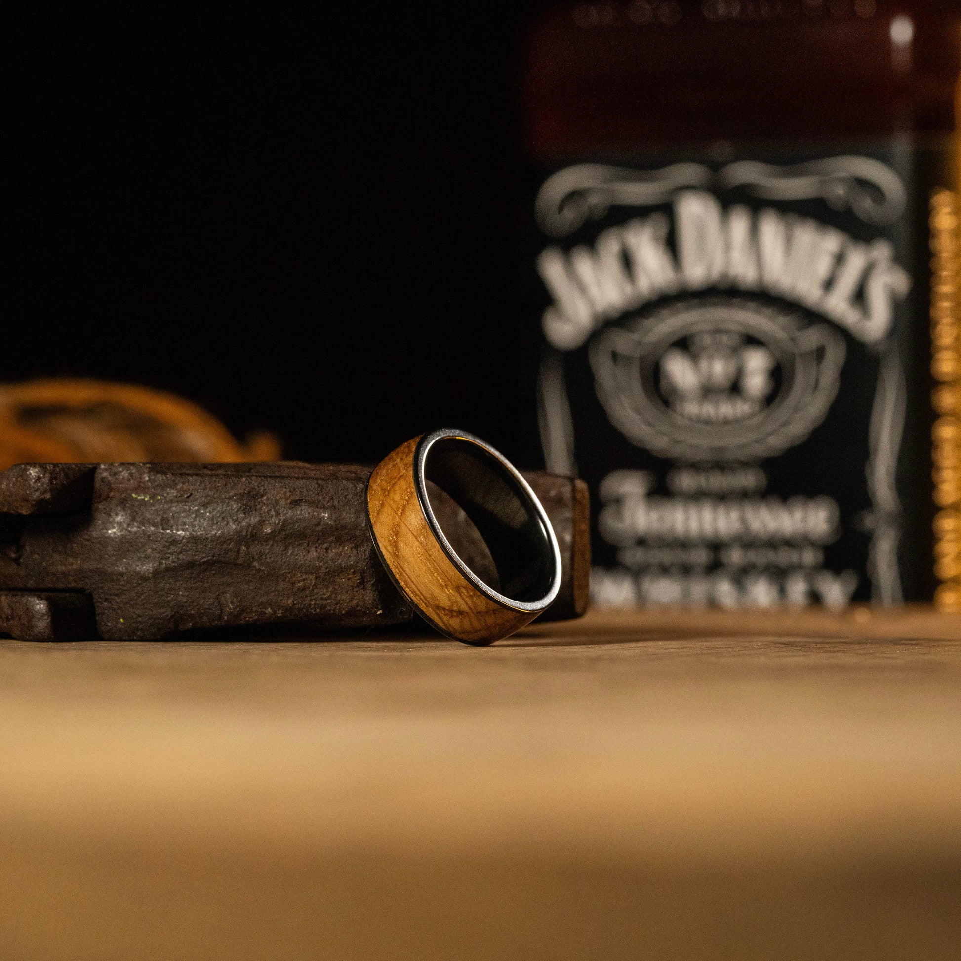 - Black Zirconium (charcoal gray color) with 7mm Jack Daniel's Whiskey Barrel Inlay